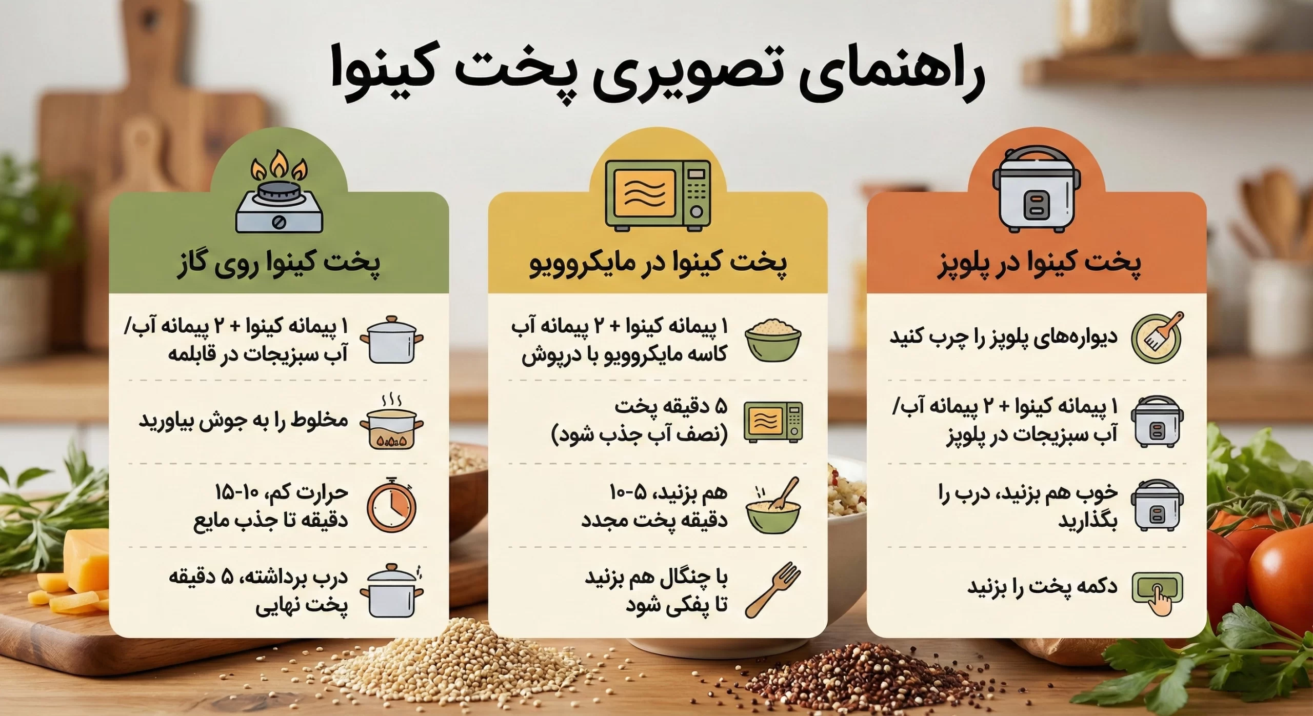 کینوا یکی از مواد غذایی است که پخت آن بسیار راحت است. در این بخش، سه روش پخت رایج کینوا را بررسی خواهیم کرد که شامل پخت روی گاز با آب، در مایکروویو و در پلوپز هستند.