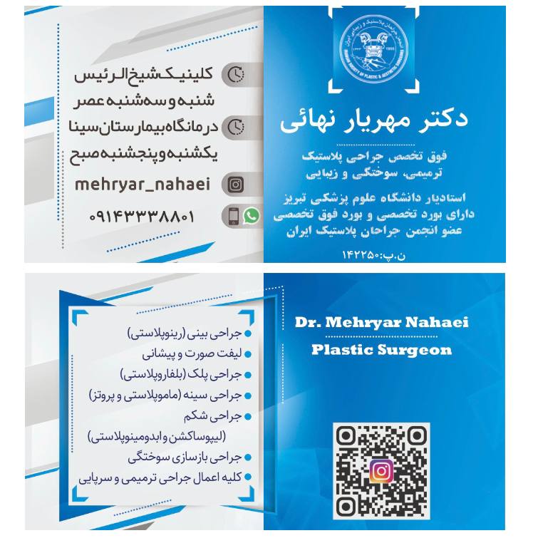 دکتر مهریار نهائی در تبریز از پزشکان فوق تخصص جراحی پلاستیک , ترمیمی سوختگی و زیبایی در تبریز میباشد و آدرس دکتر نهائی در تبریز و تلفن تماس دکتر نهائی – هست. نوبت دهی دکتر نهائی در سایت ساختمان سلامت به صورت تلفنی هست.